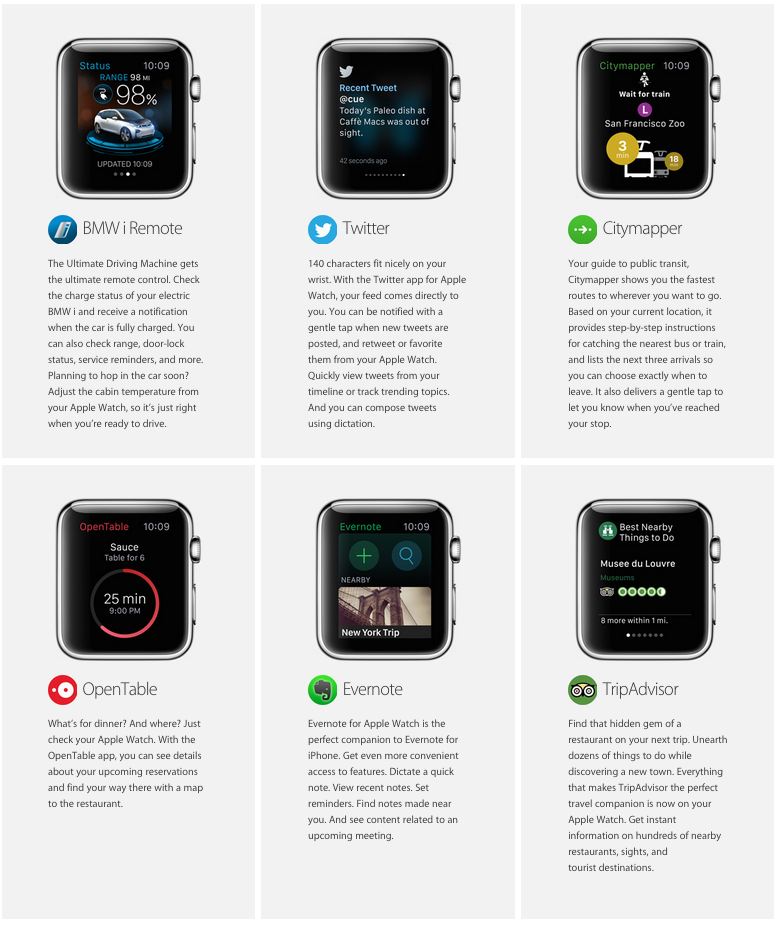 아직 애플워치용으로 어떤 화면과 기능이 제공될 것인지는 알려지지 않았습니다만 애플워치용으로 애플리케이션으로 공식 웹사이트에서 소개되고 있는 다른 서비스들이 어떠한 형태로 자신들의 서비스와 기능을 최적화하고 있는지를 보면서 여러가지 유추를 해볼 수 있을 것 같습니다.