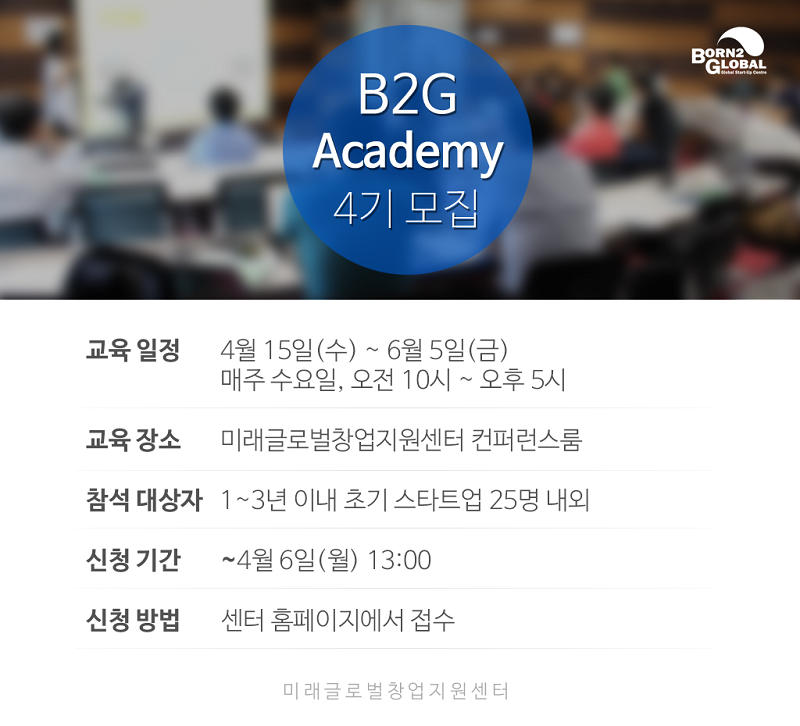 미래창조과학부 산하 미래글로벌창업지원센터는 ‘B2G 아카데미 4기 과정’교육생을 모집한다고 31일 밝혔다.
