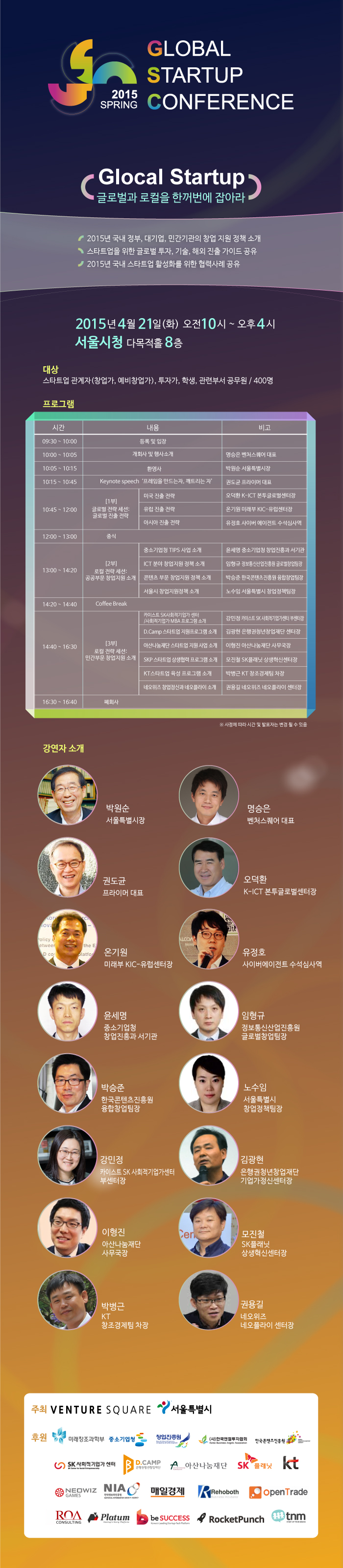 국내 대표적인 스타트업 육성 및 지원 기업인 벤처스퀘어는 오는 21일(화) 서울시청 다목적홀에서 ‘Glocal Startup : 글로벌과 로컬을 한꺼번에 잡아라’를 주제로 ‘2015 글로벌 스타트업 컨퍼런스 : 봄’ 행사를 개최 (이하 2015 GSC)한다.