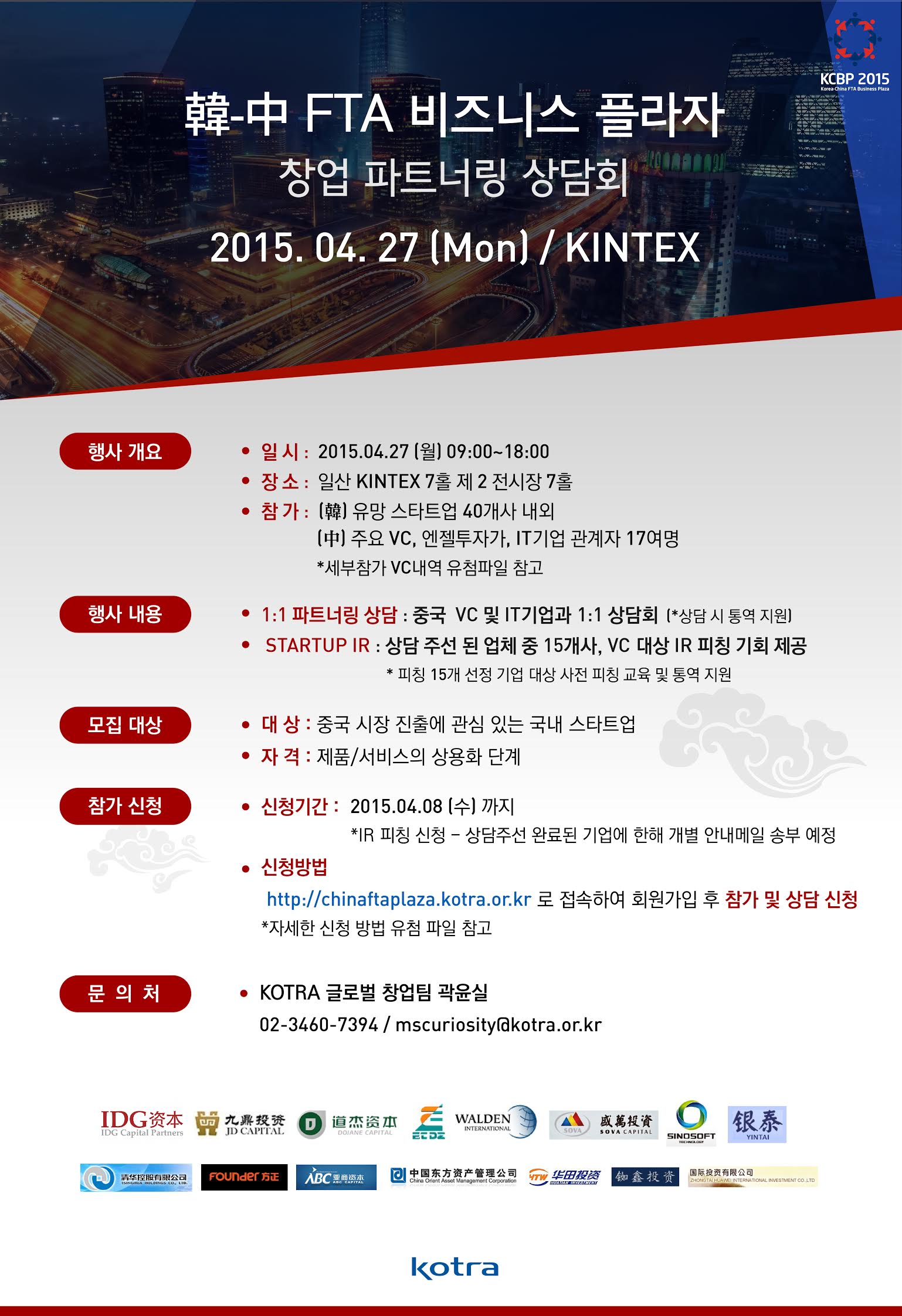 대한무역투자진흥공사(KOTRA)는 ‘한-중 FTA 비즈니스 플라자: 창업 파트너링 상담회’를 27일 일산 킨텍스 에서 개최하고 이번 상담회에 참가할 한국 스타트업 40개사를 모집한다.