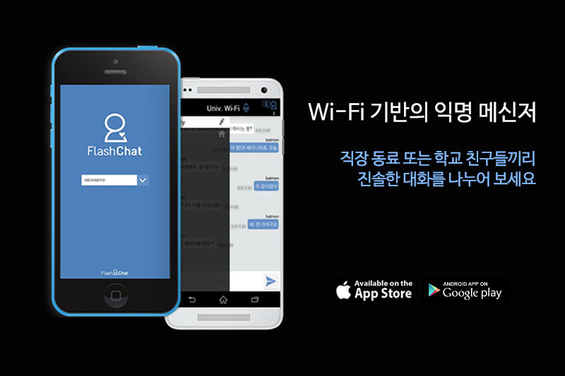 플래시챗은 와이파이 기반으로 로그인이나 별도의 인증 없이 동일한 이름의 와이파이를 사용하는 사용자들끼리 익명으로 대화를 나눌 수 있는 신개념 메신저다. 특히, 학교나 회사, 카페 등의 와이파이를 주로 사용하는 장소에서 익명으로 대화가 가능하고, 와이파이를 벗어나면 대화내용이 삭제되어 비밀이 보장되는 것이 특징이다.
