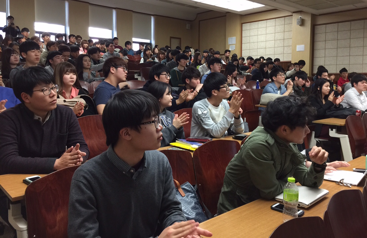 수업이 끝난 뒤 20여명의 학생들이 이 대표한테 몰려와 이것저것 묻고 명함을 달라고 했다. 열기가 대단했다. 수업 진행을 담당하는 디캠프 김윤진 메니저한테 물어봤다. 원래 저렇게 강연을 잘하냐고. 매니저는 “이 대표 강연을 여러 번 들어봤는데 오늘 강연이 특히 인상적이다”고 했다. 이 대표를 처음 만난 건 지난달 미국 텍사스 오스틴에서 열린 사우스바이사우스웨스트(SXSW) 행사장에서였다. 밝고 자신감 넘치는 모습… 얘기를 나누다가 ‘한양대에서 강연해 달라’고 간곡히 요청했다. 요청을 받아주고 멋진 강연을 해준 이 대표한테 감사한다. 공연으로 세계를 휘어잡는 날까지 응원하겠다.