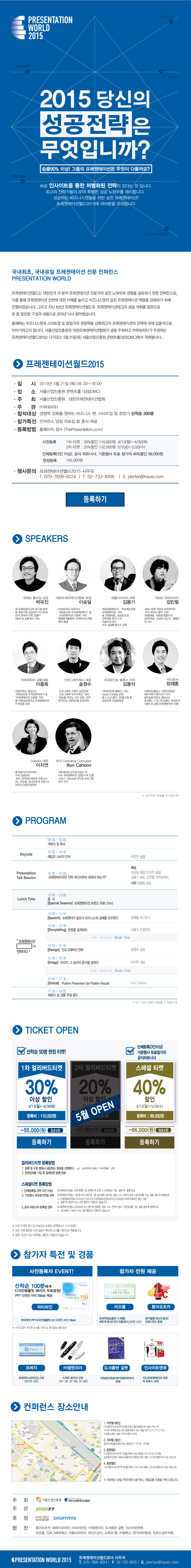 프레젠테이션월드2015 참석을 위한 사전등록은 웹사이트를 통해 할 수 있다. 행사와 관련한 자세한 문의는 프레젠테이션월드 2015 사무국(070-7609-8214)에서받고있다..