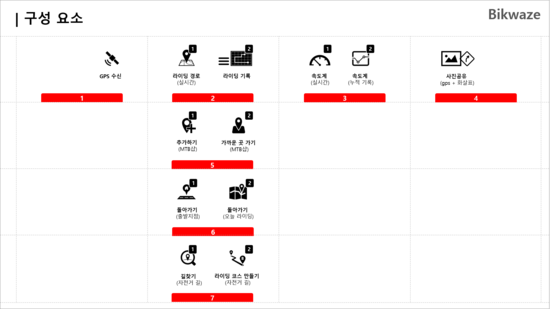 어떠한 요소들이 있어야 자전거 네비게이션을 만들 수 있을지 필수요소와 서비스 요소를 포함하여 구성요소를 정의했습니다. 보통은 글로 작성하죠.