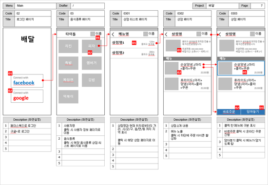 위의 화면스케치와 스토리보드는 동일한 서비스를 표현한 것입니다. 비교해보니 똑같죠. 배달읍식 앱을 만들려고 할 때 이렇게 만들어 달라 하는 문서입니다.
