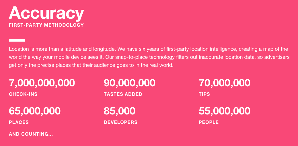 최근 포스퀘어가 새로운 광고 상품으로 드라이브하고 있는 핀포인트(Pinpoint) 웹 사이트에 공개된 데이터에 따르면 포스퀘어/스웜을 아울러 그동안 기록된 체크인은 70억 건을 넘어 섰습니다. 장소를 기준으로 보면 6500만건을 넘어섰습니다만 사용자 수는 5500만명에 머물렀습니다. 이 숫자가 활성 사용자 수인지는 확인되지 않았지만 소셜 네트워크 서비스 관점에서 봤을 때 적은 사용자수로 70억의 체크인을 만들었다는 것은 사용자층의 몰입도가 높다고 해석할 수 있다는 여지는 충분할 것 같습니다.