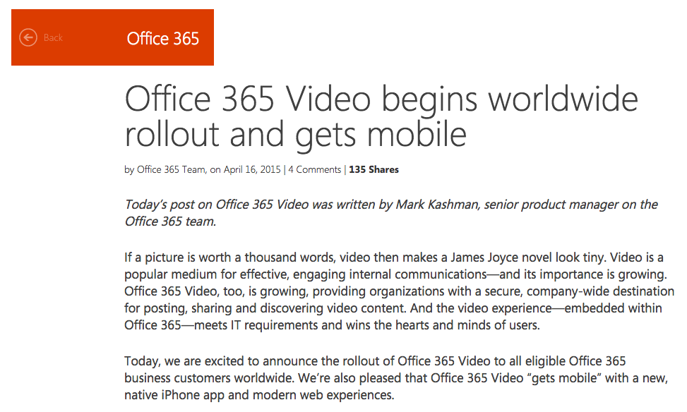 오피스 365 비디오 서비스 iOS 네이티브 앱 공개 관련 공식 블로그 (Q&A 포함)