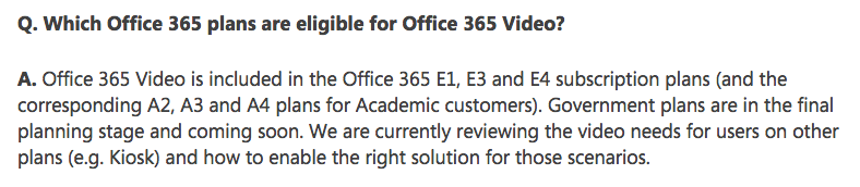 아쉽게도 오피스 365 비디오는 모든 오피스 365 사용자들이 이용할 수 있도록 개방된 서비스는 아닙니다. 자신의 회사가 현재 계약되어 있는 플랜이 어떤 것인지를 관련 Q&A 를 통해 확인해 보시거나 마이크로소프트쪽으로 문의하여 오피스 365 비디오의 사용에 대한 권리가 있는지 확인해보셔야 합니다.