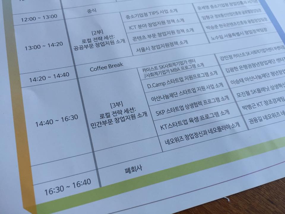 오후에는 로컬 전략 세션으로 공공부문 창원 지원 및 민간부문 창업 지원에 대한 구체적인 정보를 얻을 수 있는 프로그램이 준비돼있습니다. 중소기업 TIPS 사업내용은 물론 서울시청, 디캠프(D.Camp), 아산나눔재단, KT, SK 플래닛, 네오위즈 등 관련 담당자가 전해주는 생생한 스타트업 지원 정보를 들으실 수 있습니다.
