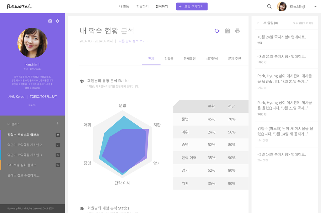 사용자의 오답 목록을 학습세부요소별로 비교 분석하여, 절대 점수가 아닌 상대점수를 통해 객관적으로 취약한 영역을 분석해준다. 시험 성적만으로는 알기 힘든 단원별 분석 결과를 제공하고, 취약 영역의 추천 문제비율을 높여 균형있는 학습을 유도할 수 있다.