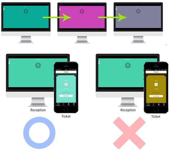 – 기본 Check-in 설정인 QR 코드를 Color Sync로 변경하면, 게스트가 보유한 티켓도 자동으로 QR 코드에서 Color Sync 방식으로 변경됨. Check-in 시작과 함께 관리자 화면의 색상이 매초 변경되는데, 게스트의 티켓 색상도 이와 동일하게 변경됨. 매초 색상이 매칭되면 해당 티켓은 유효한 것으로 판단, 자동으로 Check-in이 가능함