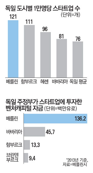 ‘가난하지만 섹시한 도시(poor but sexy city).’ 베를린이 내세운 캐치프레이즈다. 독일 정치 수도지만 동서독 통합 이후에도 별다른 산업·경제 기반이 없었던 베를린이 자유분방한 문화와 스타트업이 결합하면서 유럽의 실리콘밸리로 급부상하고 있다. 베를린시에 따르면 최근 매년 일자리가 2만~3만여 개 생겨났다. 스타트업 활약이 컸다는 분석이다. 2013년 기준 인구 1만명당 스타트업 수는 베를린이 121개로 독일 도시들 가운데 가장 많았다. 부동산 평가 포털인 라무디 등은 베를린 스타트업 수가 5년 안에 영국 런던을 제칠 것이라는 분석을 내놨다.