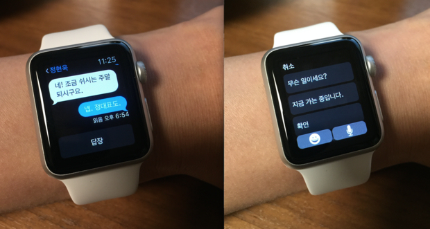 짧은 문자메시지는 읽고 나서 바로 애플워치에서 답할 수 있다. “지금 가는 중입니다” 등의 미리 입력된 답을 하거나 음성인식기능으로 내용을 입력해 답하는 것이 가능하다. 애플워치로 처음 받은 문자메시지에는 “네 알겠습니다”라고 음성인식으로 답했다.