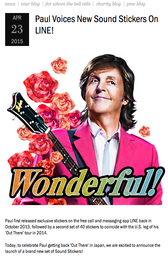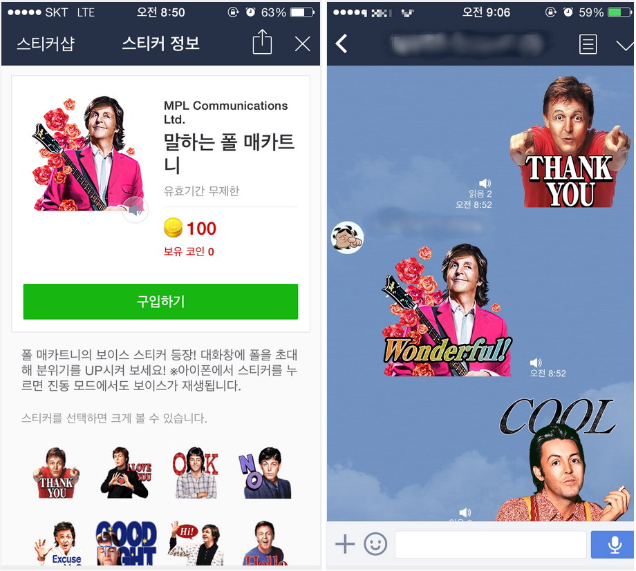 이번에 글로벌향으로 출시된 폴 매카트니의 사운드 스티커는 라인 코인 기준으로 100 코인, 실제 통화 기준으로는 1.99 달러선으로 구입할 수 있으며 24가지 재미있는 폴 매카트니의 표정과 육성이 담겨있어 그 재미를 더해줍니다.