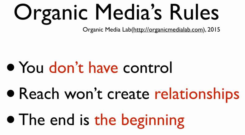 오가닉 마케팅은 미디어의 정의를 그대로 따른다. 오가닉 미디어란 미디어를 살아있는 유기체로 보는 관점이며, 그래서 진화하는 네트워크가 핵심이다. 전통적 미디어가 메시지(콘텐츠)를 ‘전달’하는 역할을 해왔다면, 오가닉 미디어는 관계를 ‘매개’하여 네트워크를 만든다. 물리적 공간에 기반한 미디어의 시대는 끝났다.
