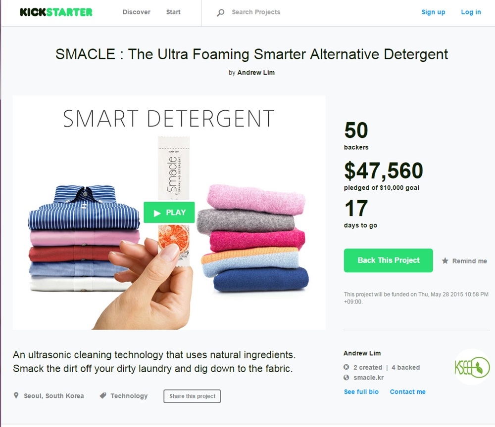 스마클 세제를 개발한 제이앤케이사이언스는 지난달 28일 크라우드펀딩 개시 이후 5월 11일까지 킥스타터에서 4만 7,560달러, 인디고고에서 1만 3,997달러를 모집해 총 6만 1,557달러의 크라우드펀딩을 모집했다고 전했다.