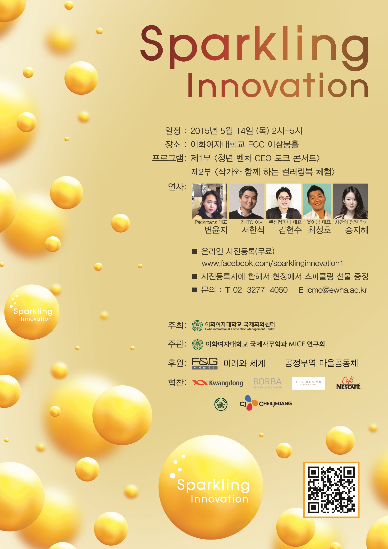 스파클링 이노베이션 행사는 이화여대 ECC 이삼봉홀에서 개최되며 창의적인 생각으로 혁신을 주도할 작은 기적의 주인공이 되고 싶은 2030 청년 누구나 참여 가능하다.