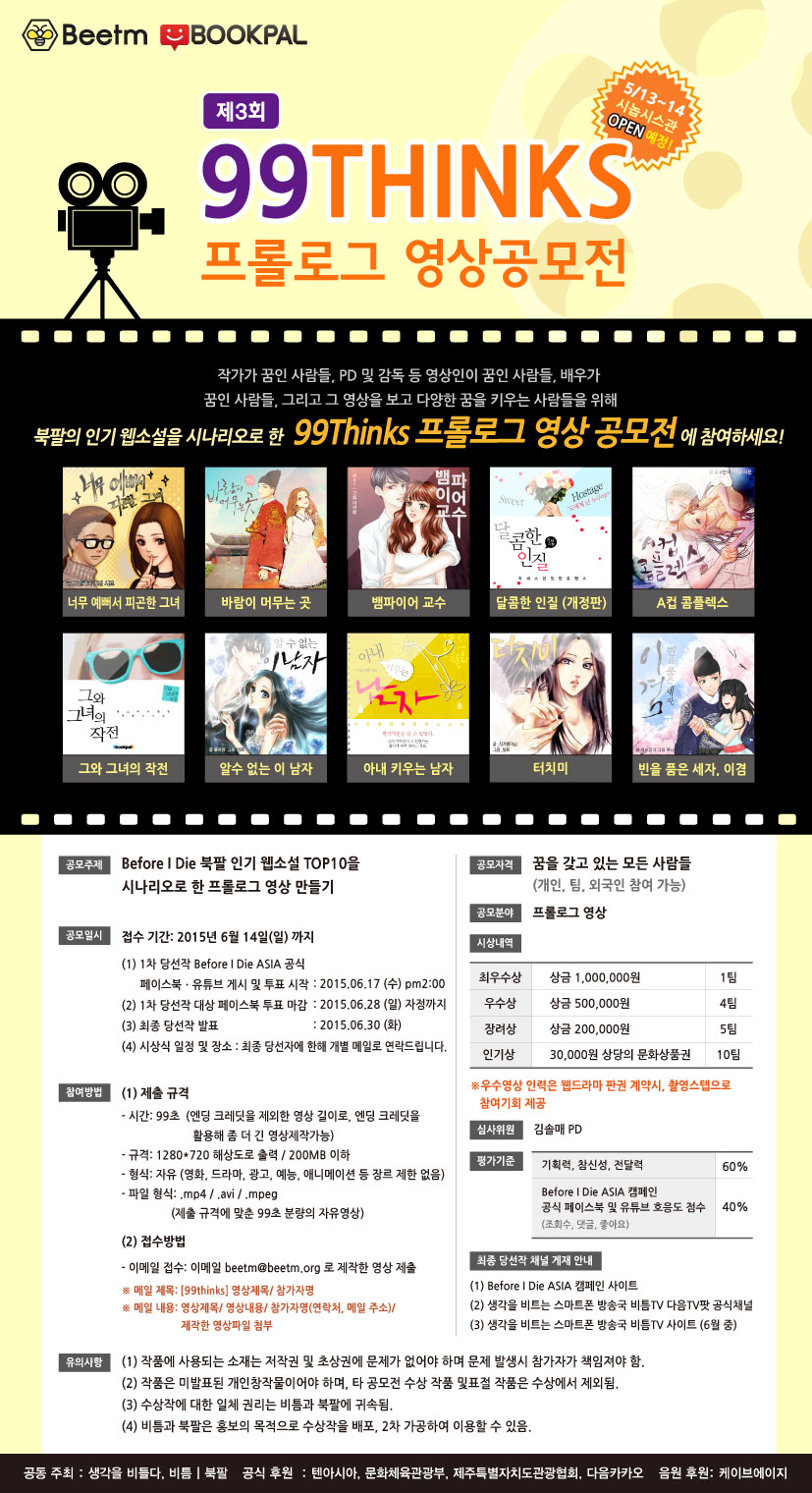 모바일 콘텐츠 전문기획사 북팔과 ‘Before I Die ASIA’ 캠페인의 주관사인 비틈이 주최하는 “99THINKS 프롤로그 영상 공모전”의 수상자에게 웹드라마 제작진으로 계약할 기회가 주어져 화제가 되고 있다.