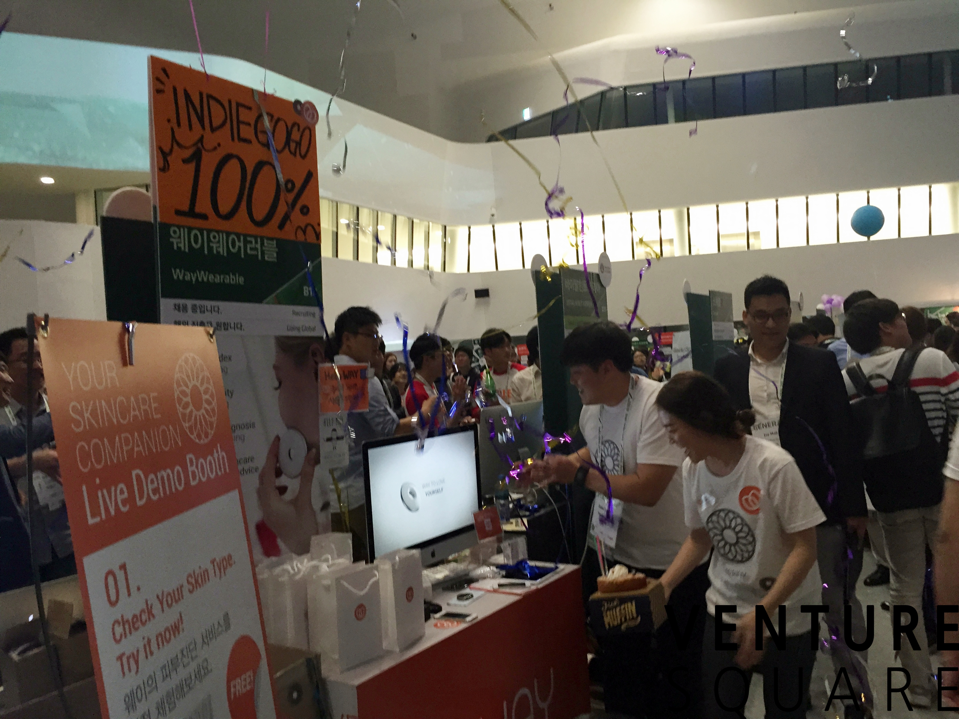 행사 이틀 째에도 부스 참여 스타트업에 대한 뜨거운 관심은 이어졌다. 특히 피부 관리를 위한 웨어러블 기기 웨이를 만든 ‘헬로웨이’는 비글로벌 부스 전시 중에 인디고고 프로젝트의 목표 금액 5만불을 100%달성하는 성과를 거뒀다.