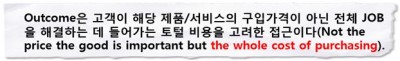 고객이 얻고자 하는 결과는 오히려 제품이나 서비스를 제공받은 이후에 발생하기 마련이다.따라서 JOB에 대한 해석을 고객이 해당 상품의 구입가격이 아닌 전체 JOB을 해결하는 데 들어가는 토털 비용을 고려해야 한다(Not the price of the good is important but the whole cost of purchasing). 예를 들어 자동으로 크기 조절 가능한 최신형 드릴 제품을 구입한 고객은 드릴을 이용해서 구멍을 벽에 뚫는 작업은 쉽게 해결할 수 있게 되었다.
