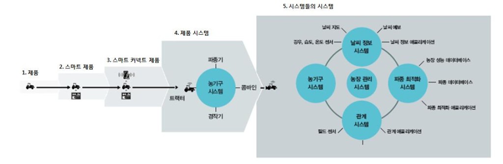 단순히 트랙터라는 농기구를 생산하던 회사가 스마트한 트랙터, 스마트+커넥티드 트랙터를 거쳐 다른 농기구와 연결되어 데이터와 농기구들을 모니터링/컨트롤하는 농기구 시스템으로 발전하고, 날씨 정보 시스템, 농기구 시스템, 관개 시스템, 파종 최적화 시스템이 하나로 연계된 농장 관리 시스템으로 변화하는 진화 과정을 보여준다. 단순히 트랙터를 제조하는 제품 제조사가 사물인터넷을 통해 농장 관리 시스템 비즈니스로 확장되는 것이다. 이는 ROA에서 집중적으로 연구하고 있는 플랫폼 비즈니스와도 일치하는 부분이다.