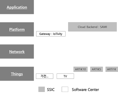 최근 행사를 가진 OIC의 IoTivity는 삼성전자 소프트웨어센터(전사 조직이기는 하지만 DMC 연구소와 협업을 많이 함.)에서 진행하고 있으며, ARTI과 SAMI는 미국의 SSIC를 중심으로 진행되고 있음. OIC의 IoTivity는(Permissive) 오픈소스 기반이기는 하지만 인증 등을 통해 삼성전자 가전, TV, 스마트폰 등의 IoT 환경 내 사용성을 지원하기 위한 것으로 판단됨. 그리고 삼성전자의 전자 제품을 지원하기 위한 것으로 스마트홈을 우선 Target으로 진행되고 있음.