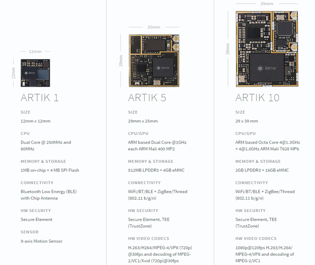 둘째 SSIC(Samsung Strategy and Innovation Center) 사장이 미국 모스콘 센터에서 열린 컨퍼런스에서 초소형 반도체 하드웨어 플랫폼(아틱1, 아틱5, 아틱10)을 발표함. 아틱10은 ARM-Cortex A15, A7를 각각 4개씩 탑재한 옥타코어로 홈 서버 및 멀티미디어 재생기기에 적합함. 아틱5는 ARM Cortex A7 2개로 네트워크 카메라, 드론 및 웨어러블 기기에 적용 가능한 것임. 마지막으로 아틱1은 통신 기능은 BLE만 지원하며 저성능 저소비전력용 기기에 적합한 것임. 추가적으로 조사해 보면 ARTIK 홈페이지와 연결된 SAMI는 센서 및 기기 등 사물들의 데이터를 저장 및 API화 시키는 클라우드 플랫폼으로 보임.