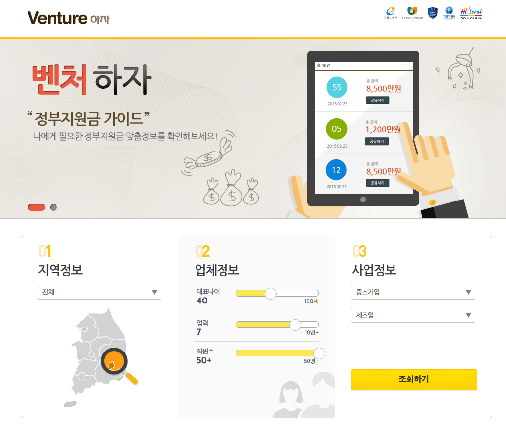 벤처하자에 접속하면 별도의 가입절차 없이 자신이 속한 지역, 나이, 업력, 직원 수와 회사 규모, 업종을 선택하고 조회하기를 누르면 선택한 조건에 맞는 정부 지원사업이 검색된다.
