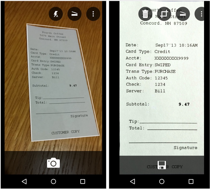 회사 업무를 위해 경비를 사용한 경우 회사에 영수증 스캔본을 제출하는 경우가 많습니다. 종이에 붙이고 복합기로 스캔해서 메일로 보내는 과정, 정말 번거롭고 불편하죠. 오피스 렌즈의 훌륭한 트랜스폼(Transform), 보정기능은 작은 영수증 조차도 깔끔하게 이미지 파일이나 PDF 로 만들어 줍니다.