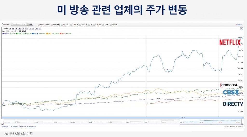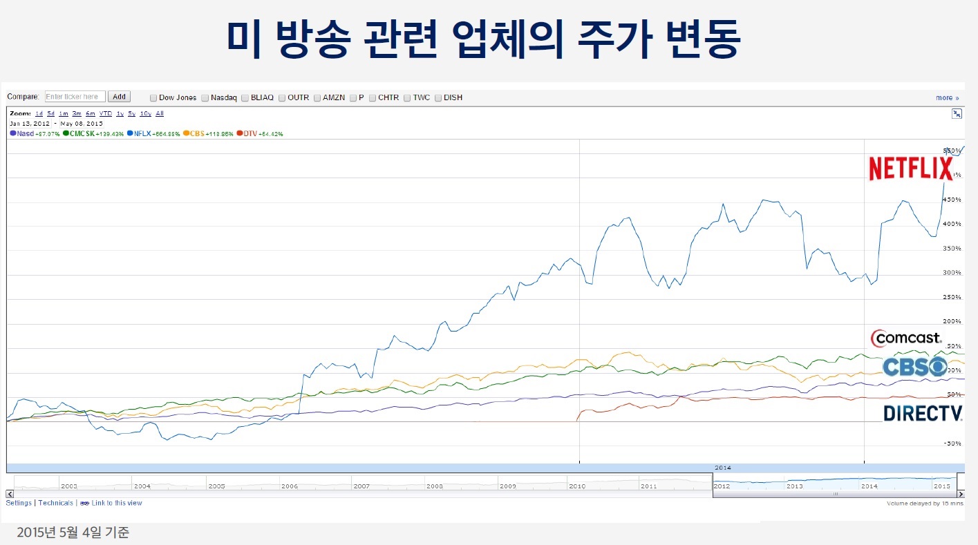 넷플릭스는 주가가 5배 상승하였습니다. 반면 전통적 방송 사업자들은 나스닥 시장 전체의 성장률 큰 차이가 없습니다