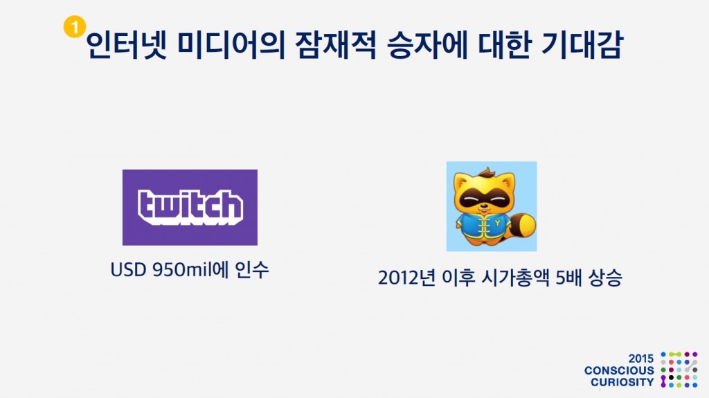 인터넷과 모바일 미디어들 역시 ‘인터넷 비즈니스’ 로서 ‘승자 독식’이라는 특성을 나타낼 것으로 보입니다.따라서, 선도 업체의 기업가치는 어마어마 할 것 입니다.실제로, 작년 아마존에 인수된 게임 전문 인터넷 방송 Twitch의 인수 가격은 1조원을 넘어섰고, 중국의 아프리카TV인 YY는 2012년 이후 시가총액이 5배 상승 했습니다.