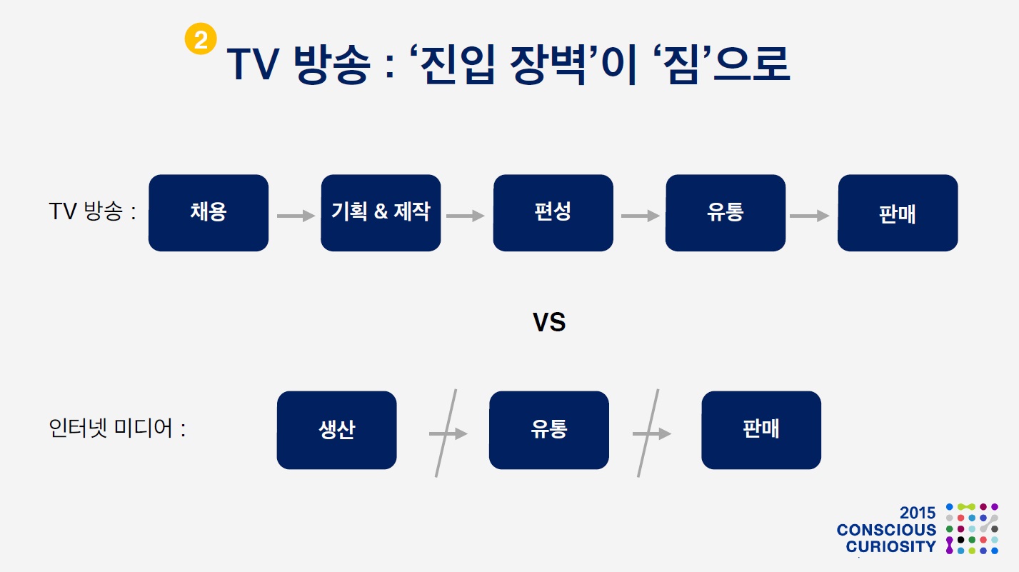 하지만 최근의 인터넷 미디어들은 생산, 유통, 판매가 전부 분절되어 있어 시장 진입이 자유로워졌고 변화에 훨씬 기민하게 대응하게 되었습니다.