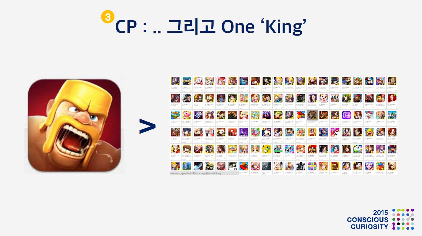 전 세계 모바일게임 매출 순위 1위인 클래쉬 오브 클랜의 매출액은 중위권 이하 수백개 게임의 매출을 합한 것 보다 많을 것 입니다.