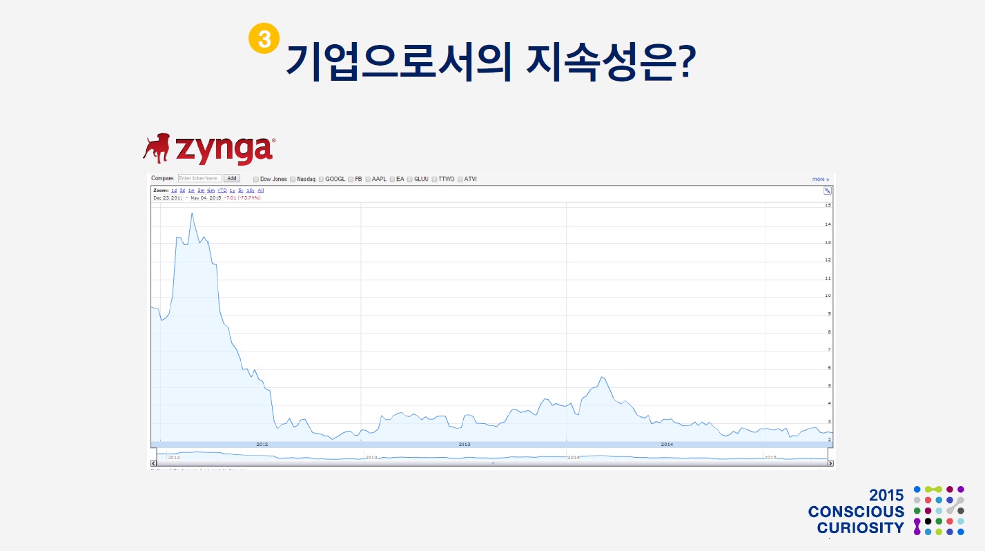 단, 컨텐츠 프로바이더로서 지속적으로 기업가치를 유지하기는 쉽지 않습니다. 소셜게임의 황재인 징가는 Farmville 등 몇 개 초대형 히트작의 탄생 이후 시가총액이 15억달러에 이르렀으나 이후 1/6 하락하여 회복하지 못하고 있습니다. 컨텐츠 프로바이더의 지속적 히트 컨텐츠 제작 능력에 대한 의문이 있는 것이죠.