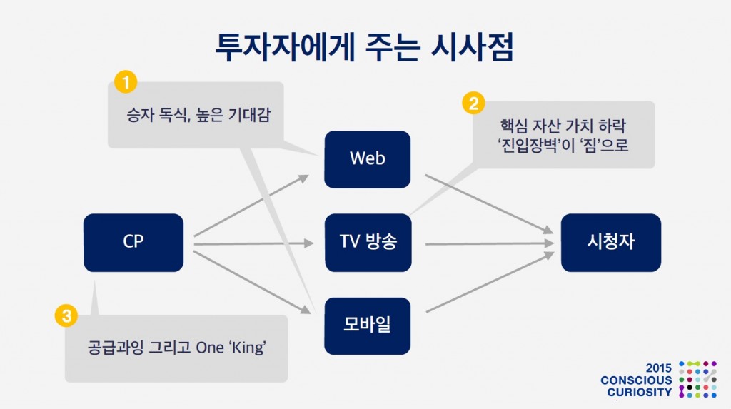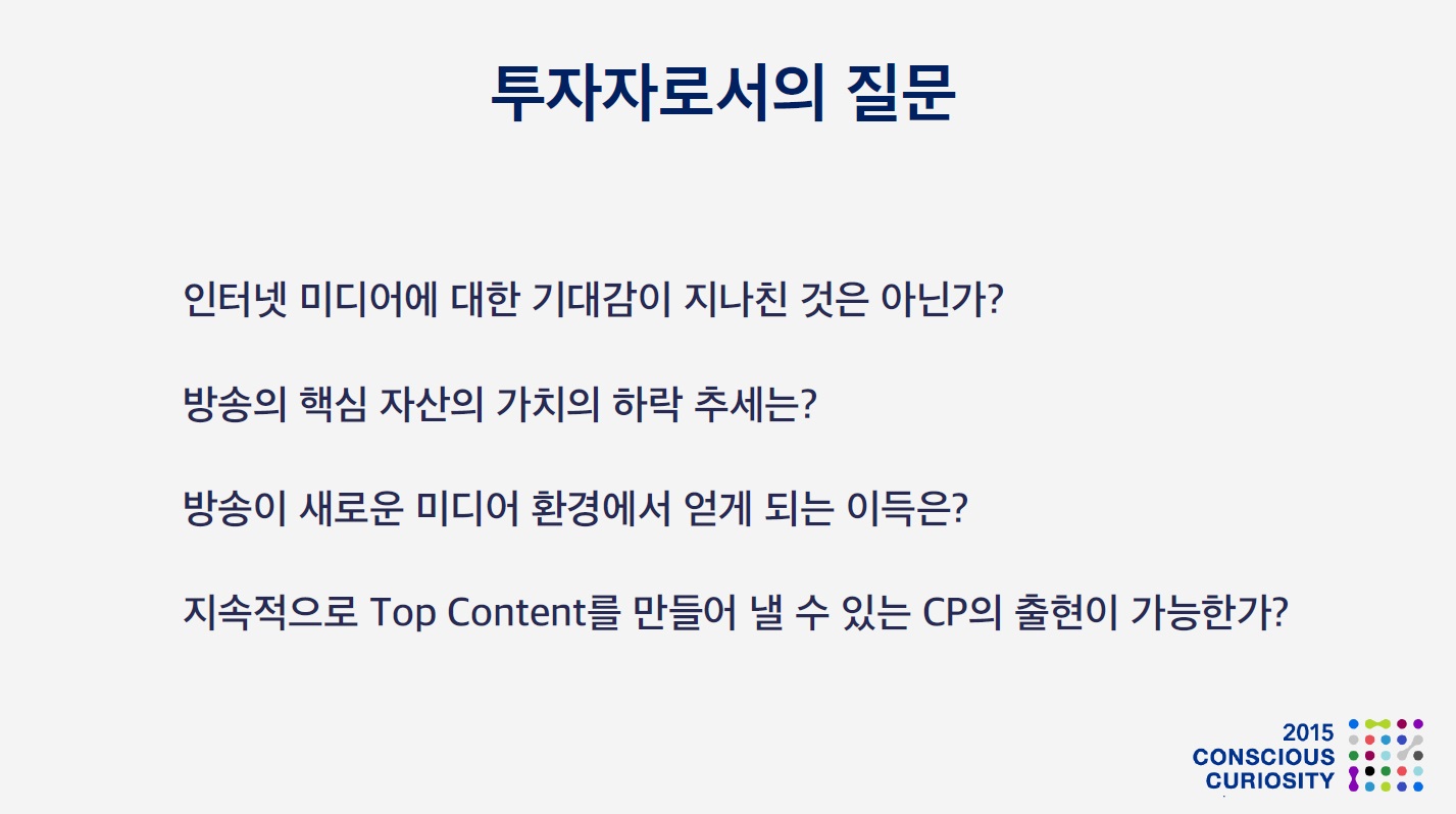 하지만, 여전히 생각해보아야 할 부분이 많습니다 인터넷 미디어에 대한 기대감이 지나친것은 아닌지, 방송의 핵심 자산의 가치는 빠르게 하락할 것인지 느리게 하락 할 것인지