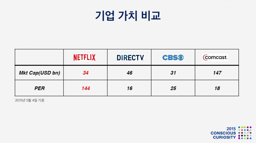 기업 가치를 비교 해 보겠습니다. Netflix는 미국의 대표적 방송사인 CBS보다 높은 기업 가치를 인정받고 있습니다. 미래가치의 척도인 PER의 차이는 더욱 심합니다. 넷플릭스의 기업가치는 연간 이익의 144배 입니다. 다시 말해, 144년치 이익만큼의 기업가치를 인정받고 있다는 뜻이죠