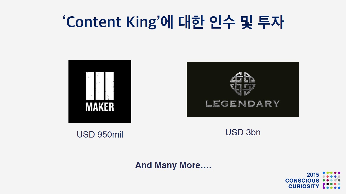 한편, 영상 산업의 또다른 축인 컨텐츠 프로바이더 중 선도 업체들은 높은 기업가치를 인정받고 투자 및 인수가 이루어지고 있습니다. 멀티채널네트워크의 대표주자인 Maker Studio는 2014년 디즈니에 9억 5천만달러에 인수되었고, 다크나이트 시리즈 등으로 유명한 레전더리픽처스는 기업가치 30억달러를 인정받고 투자를 유치 하였습니다