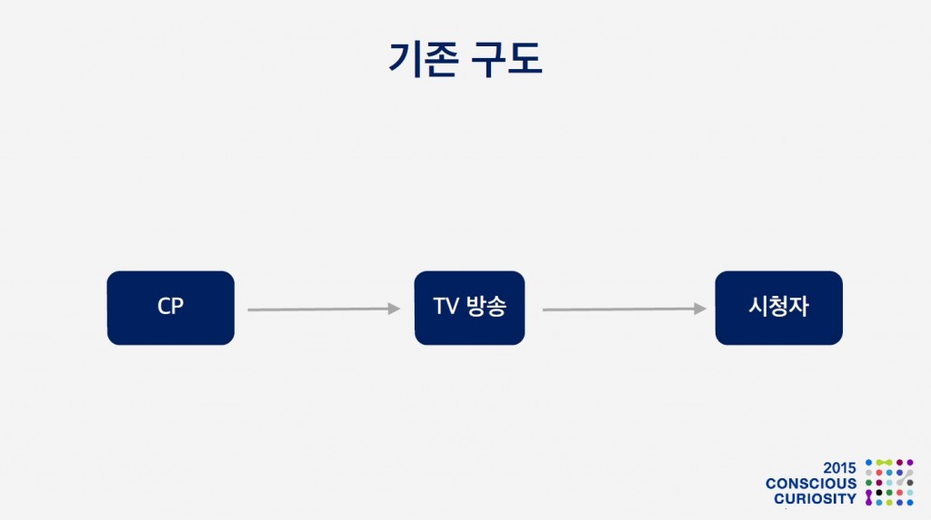 이를 위해, 방송 산업의 기존 구도를 단순하게 도식화 해 보았습니다. 컨탠트 프로바이더는 컨텐츠를 만들고 이것이 TV 방송을 통해 시청자에게 전달되는 단순한 구조였습니다.