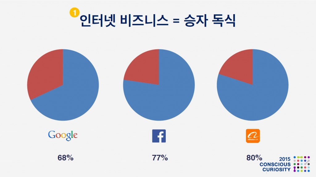 인터넷 모바일 미디어도 결국 인터넷 비즈니스의 일부 입니다. 그리고, 인터넷 비즈니스의 가장 큰 특징은 승자 독식이라는 것이죠, 다들 잘 아시다시피 인터넷의 핵심적 기능인 검색, 커뮤니케이션, 전자상거래 분야 모두 1위 업체가 시장의 대부분을 점유하고 있습니다