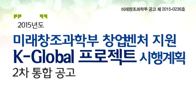 미래창조과학부는 정보통신기술 분야 창업·벤처 정책 통합·연계 방안 K-글로벌 프로젝트의 13개 사업에 대한 하반기 2차 통합공고를 실시한다고 밝혔다. 총 238억원 규모다.