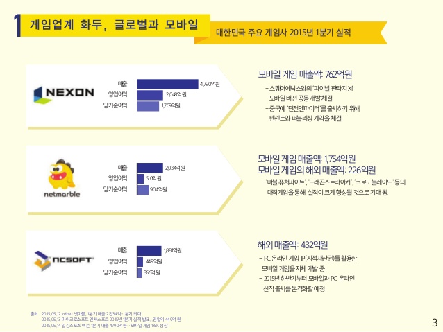 M리포트에서는 가장 먼저 대한민국 주요 게임사 2015년 1분기 실적을 보여주었습니다. 전체 실적에서 해외 매출이 어느정도의 비중을 차지하는 지 쉽게 알 수 있도록 모바일 게임 매출액과 해외 매출액으로 나누어 보여주었네요. 각 게임사 별로 글로벌 진출은 아주 효자 노릇을 하고 있다는 것을 보여줍니다. 넷마블의 경우 총 매출액 1,754억원에서 226억원 정도의 해외 매출이 있었고, NHN의 경우 499억원의 모바일 게임 매출액에서 419억원을 차지했습니다.
