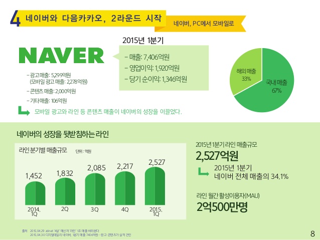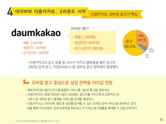 한편, 다음카카오는 2015년 1분기 매출 2,344억원으로 여기에서 광고 매출이 60.5퍼센트, 게임 매출이 29.9퍼센트 차지했고 나머지는 커머스, 기타 순이었습니다. 리포트에서는 모바일 광고 중심으로 성장전략을 이어나갈 것으로 보고 광고, 정보 탐색 등 트래픽을 확보하고 광고매출을 확대하는 등 카카오톡을 다채로운 방법으로 활용할 것으로 전망했습니다.