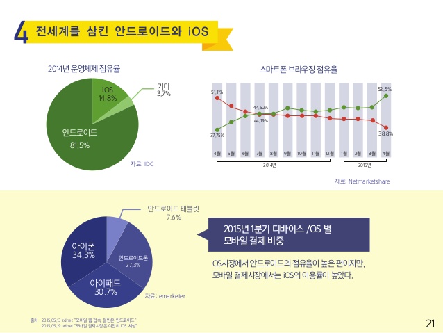 마지막으로 흥미로웠던 자료를 소개해드립니다. 바로 안드로이드와 iOS의 대결인데요, 안드로이드 운영체제는 무려 80퍼센트가 넘는 점유율을 갖고 있었습니다. 그러나 재미있는 점은 모바일 결제비중은 아이폰 34.3퍼센트, 아이패드 30.7퍼센트로 모바일 결제시장에서 iOS의 비중은 무려 70퍼센트가 넘는 압도적인 점유율을 보여주었습니다.