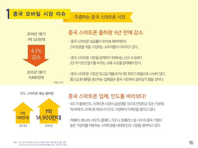 중국 스마트폰 보급률이 90퍼센트에 육박하면서 스마트폰을 처음 구입하는 소비자들이 사라지고 있다며 중국 스마트폰 시장을 공략하기 위해서는 신규수요보다 2년 주기로 단말기를 바꾸는 교채 수요를 공략해야한다는 조언을 덧붙였습니다. 또한 2016년 인도 스마트폰 예상 출하량을 1억 14,900만 대로 잡으며 화웨이, 레노버, 샤오미, 쿨패드 등 다수 중국 기업이 인도 스마트폰 시장 공략에 나설 것이라 전망했습니다.
