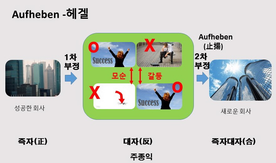 내가 누구인지 알려면 나를 나에게서 떨어트려 놓는 일이(대자) 제일 먼저 하는 일이다. 그리고 나와 떨어트려놓은 것과 나를 서로 비교하여 보아야 한다(1차부정). 갈등과 대립 모순을 통해서 서로 붙어있는 성공/실패/욕심 /부정/술수/사기/눈가림/함정 등등의 각종 부정적인 요소들과 엉켜져 있는 덩어리인 성공의 핵에서 원심분리기처럼 움직이는 운동을 통하여 하나하나 요소들을 분리해내고 찾아내어 서로 다른 것은 버리고 받아들일 것은 받아들이는 과정을 통하여 비로서 내가 누구인지를 자세히 알아 내게 된다.