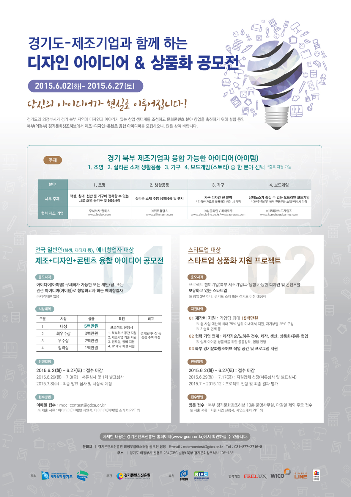 경기콘텐츠진흥원은 융합상품개발을 하는 스타트업의 부족한 제조기술, 제작(생산/설비), 유통(판로, 마케팅)분야에 실질적으로 공동협력할 수 있는 경기북부 소재 강소제조기업인 필룩스(조명), 위코홀딩스(생활용품), 코리아보드게임즈(보드게임), 심플라인(가구)와 공동 창작 지원협약을 체결하고 본격 지원에 나설 예정이다.