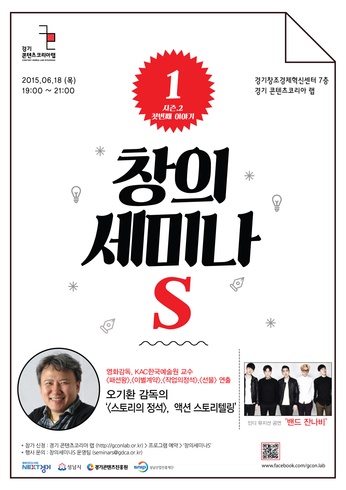 돌아온 창의세미나S 첫 회, 오기환 감독의 강연을 듣고 싶다면 얼른 자리를 ‘찜’ 하세요. 해당 강연 전에는 인디뮤지션 ‘밴드 잔나비’ 공연까지 마련되어 있으니 판교 데이트로도 안성맞춤. 1석 2조로 즐기는 창의세미나S 내 자리 찜하기는 <–바로 이 곳 링크에서 할 수 있어요.