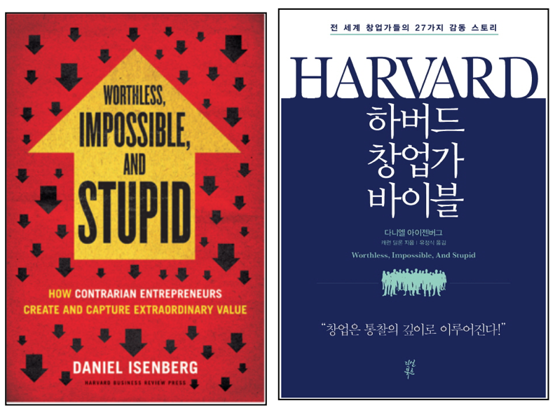 위 책도 마찬가지다. 하버드대 교수가 쓰기는 했지만 저자 이름 아래 조그맣게 ‘HARVARD BUSINESS REVIEW PRESS’라고 출판사명이 들어있는 것을 빼면 어디에도 하버드가 강조되어 있지 않다. 그런데도 번역서의 제목은 하버드 창업가 바이블이다.
