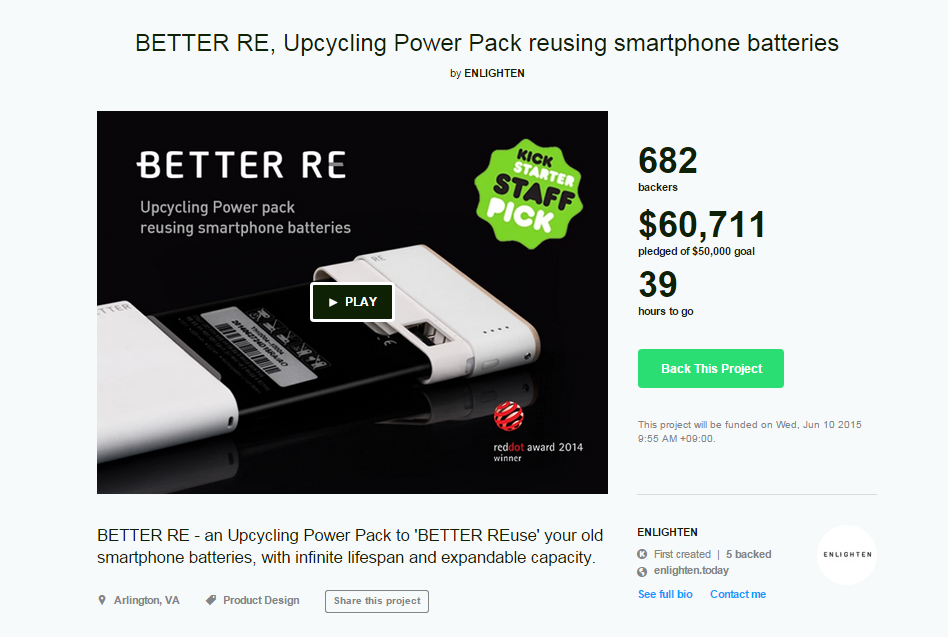 특히, 지난해 최우수상을 수상한 BetterRe는 폐스마트폰 중고배터리를 재사용해 다양한 모바일 기기를 충전할 수 있는 외장형 보조배터리를 제작, 최근 크라우드 펀딩 플랫폼인 킥스타터를 통해 총 $60,711 달러를 달성해 화제다. BetterRe 를 비롯한 지난해 수상팀들은 올 한해 자신들의 솔루션을 실제 사회에 적용한다.
