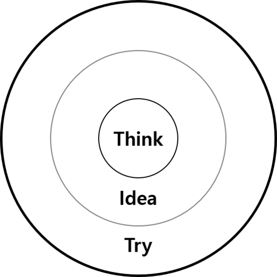 Think – Idea – Try의 순서로 실행, 실패하고 또 실행하고, 고치고 또 실행하는 실행 강조형 흐름입니다.